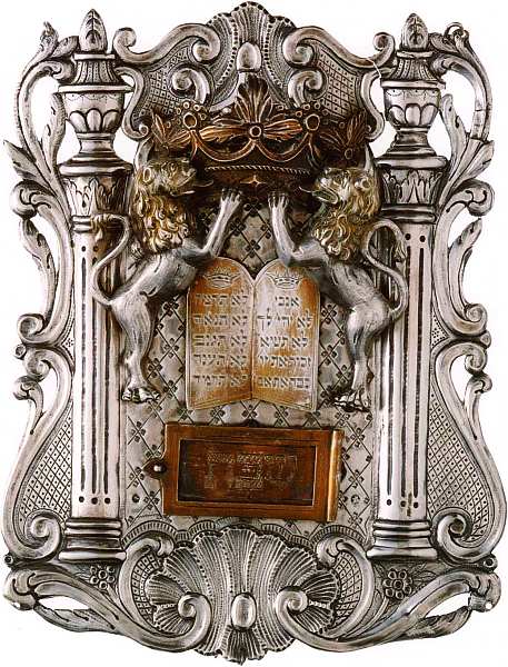 Перед нами довольно ранний пример Тора-шилд, или «щита Торы», — приспособления, задуманного для удобства использования свитка Торы в синагоге. Это небольшой серебряный щиток, прикрепляемый к чехлу, в который «одет» свиток. В нем сделаны специальные прорези, куда, как в оконца, вставляется бумажный ярлык с указанием той главы Торы, что должна читаться в ближайшем будущем. Раввины предполагали, если не перематывать свиток Торы на глазах у всей общины, а, сделав это заранее, во время литургии открыть его на нужном месте, то ритуал приобретет большую торжественность. Многие считали, что бумажные ярлыки недостаточно красивы, поэтому названия недельных глав должны записываться прямо на серебряных пластинках.