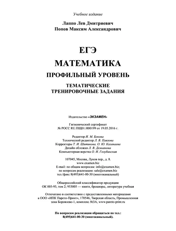 -  ЕГЭ 2017. Математика. Профильный уровень. Тематические тренировочные задания  (и.с. ЕГЭ. Супертренинг) 7.99 Мб скачать:- (djvu) - (djvu+fbd)  читать: (полностью) - (постранично) - Лев Дмитриевич Лаппо - Максим Александрович Попов