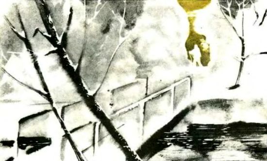 Нужно было проверить одну узкую дорогу среди дремучего леса. Деревья стояли вокруг великанские. Сосны вершины подняли до небес. Ели ветви опустили до самой земли. Снегу на них насыпано — целые сугробы. И дорога вьётся по узкой просеке, как по ущелью. И глубина снегов в лесу такая, что узкие лыжи тонут, в сторону не свернёшь.