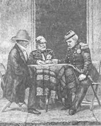 Командование союзными войсками под Севастополем: генералы лорд Раглан, Омер-паша и Пелисье. 1855 г. Рисунок с фотографии Р. Фентона.