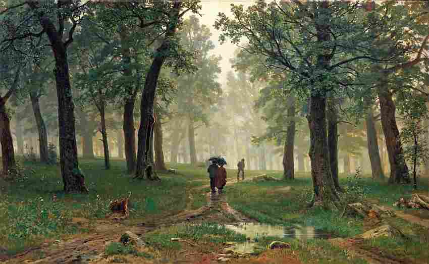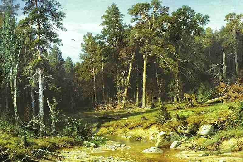 Тема подвижной, пульсирующей жизнью природы, закрепленная в панорамном строении ландшафта, — лишь слабый отклик на «идеологию» романтизма. В картине Шишкина, как и у некоторых других поздних романтиков, преобладает оптимистическое восприятие необъятного мира. Не торжество над человеком, не угнетение его дикими и грозными стихиями, как в пейзажах дюссельдорфцев, а дружественное согласие человека и природы — таков лейтмотив шишкинского произведения.