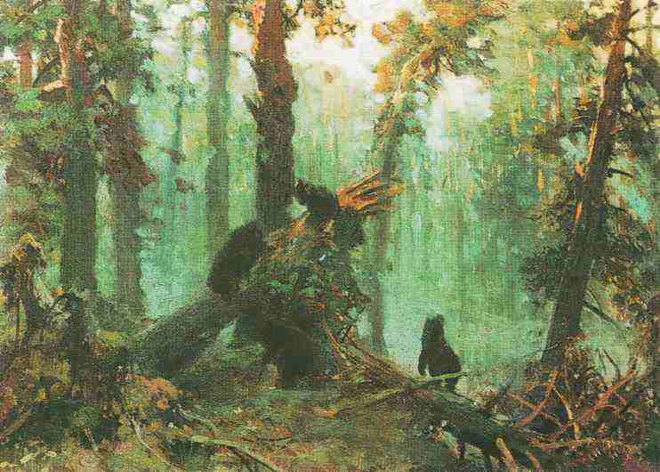Утро в сосновом лесу. Выпускались конфеты, на обертке которых воспроизводилась та же картина. Между тем хорошие репродукции произведений Шишкина не издавались. Таким образом, опошлялось творчество, достойное трезвого и беспристрастного суждения. Искаженное представление об искусстве мастера вошло в сознание наших современников: стало почти хорошим тоном криво улыбаться при упоминании имени Шишкина.