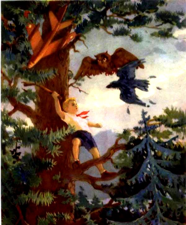 С зловещими криками Филин и Ворон закружились над головой мальчика, который судорожно вцепился в тонкий сук, все время рискуя сорваться с головокружительной высоты.