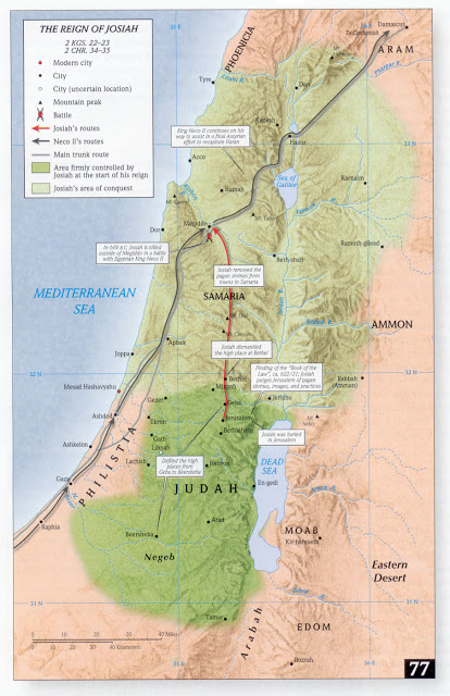 Поэтому крепость Мегиддо, вероятно, предоставляет недостающее звено, объясняющее схватку с Нехо. Было отмечено, что Иосия захватил все горные территории бывшего северного царства, а затем распространился дальше на север к Мегиддо и сделал его своим северным стратегическим форпостом. Контроль над всем районом от Иерусалима до долины Изреель позволял Иосии выступить со своей армией к Мегиддо, возможно, пытаясь не дать Нехо оказать помощь ассирийской армии в войне против вавилонян.