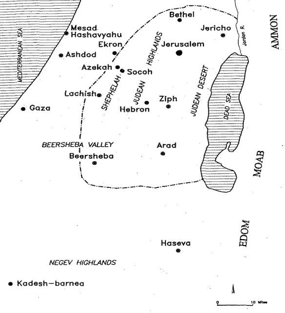 Когда все эти элементы нанесены на карту в отдельности, их распространение очень похоже. Оно простирается от долины Беэр-Шевы до плато Вефиля к северу от Иерусалима, от Мёртвого моря и Иорданской долины до верхней Шефелы. Вопрос в том, является ли это границами Иудеи, и показывают ли они, что дальше на север не было никакого расширения? Или представляют ли они собой лишь основную территорию царства? В этом случае, мы должны помнить, что если кампания на севере была недолгой, она может быть недостаточно представленной в археологических данных. Но долговременное и далеко идущее присоединение новых территорий к Иудейскому царству просто не подтверждено археологическими находками.