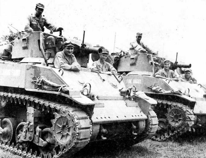 Средний танк «Шерман» со 105-мм гаубицей и огнеметом POA-CWS-H5 из состава 5-го полка морской пехоты движется по дороге к Сеулу. Корея, сентябрь 1950 года