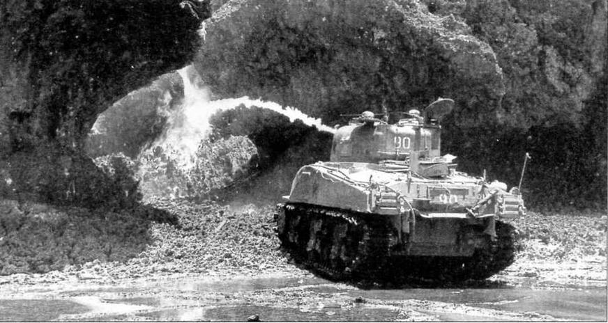 Танк М4 из состава 713-го огнеметного батальона выжигает японскую пехоту, засевшую в прибрежных скалах на о. Окинава. 1945 год