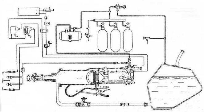 1 — резервуар; 2 — воздушный коллектор; 3 — жидкостный коллектор; 4 — трубопровод дымовыпуска; 5 — трубопровод к огнемету; 6 — гибкий шланг; 7 — брандспойт; 8 — зажигалка; 9 — щиток распылителя; 10 — вентиль дымовыпуска; 11 — огнеметный вентиль; 12 — воздушный баллон; 13 — сливной кран; 14 — насадок системы дымопуска