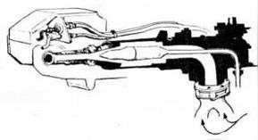 1,12 — вентили; 2 — распределитель; 3 — редуктор; 4 — воздушный баллон; 5 — рукоятка управления брандспойтом; 6 — брандспойт; 7 — зажигалка; 8 — наклонный лобовой лист корпуса; 9 — шаровое соединение; 10 — трубопровод; 11 — задвижка; 13 — манометр; 14 — масляный затвор; 15 — резервуар для огнесмеси; 16 — корпус танка