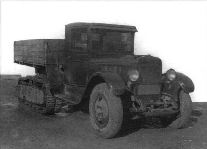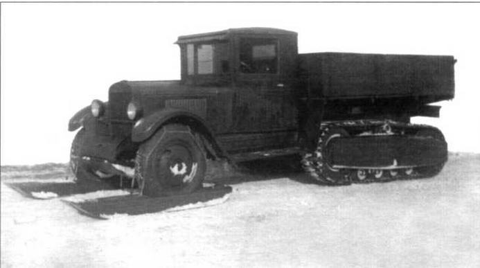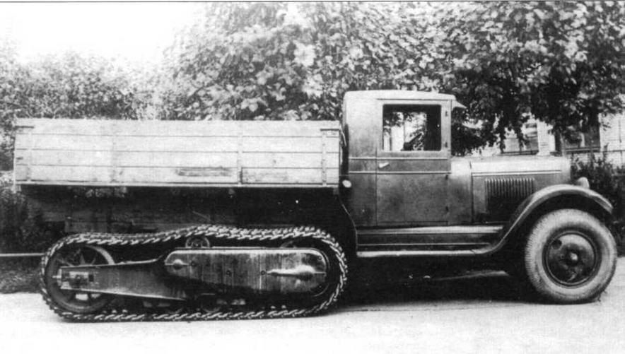 2, требуемой для уверенного движения по тяжелому бездорожью. Балансирная же подвеска хорошо приспосабливалась к неровностям грунта и, что важно, — снега: не срезала выступы, а взбиралась на них. Однако при движении по рыхлому снегу реактивный момент, возникавший на тележке от цепного привода, вызывал «зарывание» ее передней части и разгрузку задней. Тем не менее, полугусеничные автомобили всерьез заинтересовали военных, увидевших в них быстроходные тягачи для буксировки дивизионной и зенитной артиллерии. К тому же использование больших производственных мощностей новых автозаводов упрощало задачу быстрого насыщения Красной Армии относительно дешевыми вездеходами.
