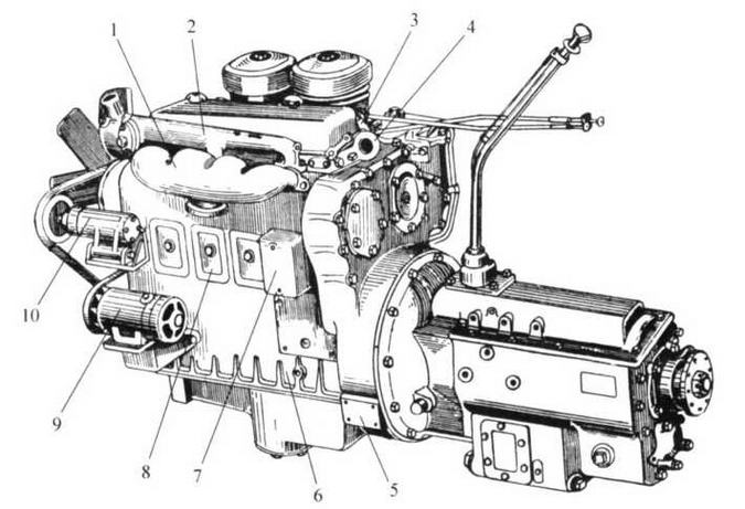 Быстрое израсходование первой партии силовых агрегатов GMC и неопределенность с их дальнейшими поставками заставили ярославцев подстраховаться и снова вернуться к идее использования на своем тягаче какого- нибудь отечественного двигателя. Осенью 1943 года таким реальным силовым агрегатом мог быть только бензиновый 6-цилиндровый двигатель ЗИС-5 мощностью 73 л.с. при 2300 об/мин вместе с двухдисковой муфтой сцепления (по танковой терминологии — ГФ) и 4-ступенчатой КП с силовым диапазоном 6,59. Он уже в достаточных количествах производился Миасским автомоторным заводом, а с января 1944 года там начался выпуск улучшенной модификации ЗИС-5М с повышенной степенью сжатия (5,3) мощностью 76 — 77 л.с. (до 80 л.с.), с измененной регулировкой карбюратора МКЗ-6В и максимальным крутящим моментом на маховике 28,7 кгс/м (ранее — 28 — 28,5).