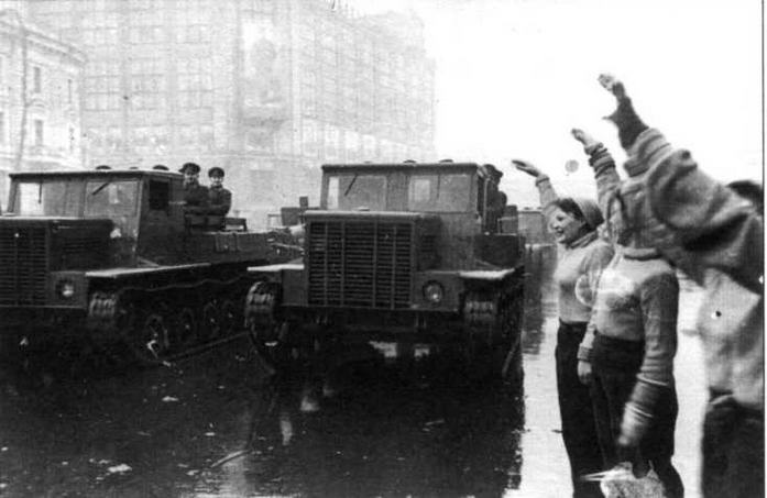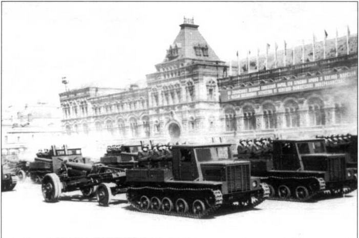 В парадном строю — тягачи Я-12 со 152-мм гаубицами-пушками МЛ-20 на буксире. Москва, 7 ноября 1947 года