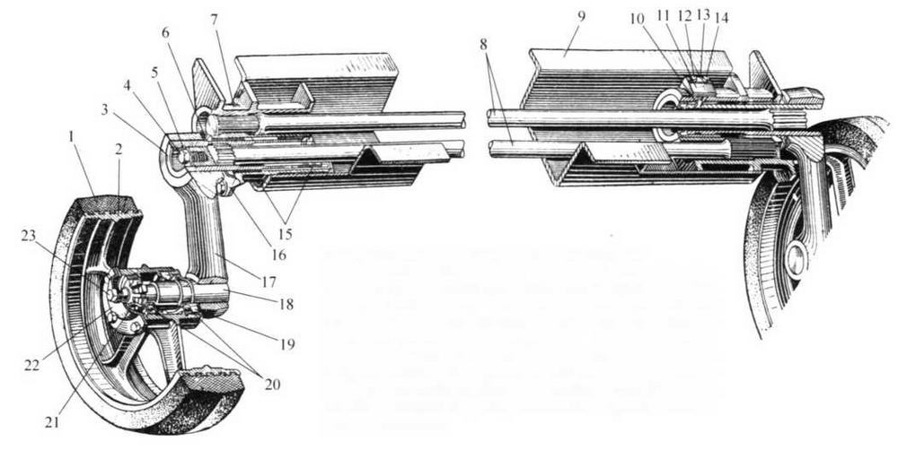 1 — резиновый бандаж; 2 — опорный каток; 3 — ось балансира; 4 — болт крепления балансира; 5 — стопорные шайбы; 6,19—сальники; 7—кронштейн оси балансира; 8 — торсионные валы; 9 — коробчатая поперечина рамы; 10 — сухарь; 11 — крышка сухаря; 12,14 — болты; 13 — замочная пластина; 15 — втулки кронштейна; 16 — крышка сальника; 17 — балансир; 18 — ось опорного катка; 20 — подшипники; 21 — гайка; 22 — крышка ступицы катка; 23 — пробка смазочного отверстия