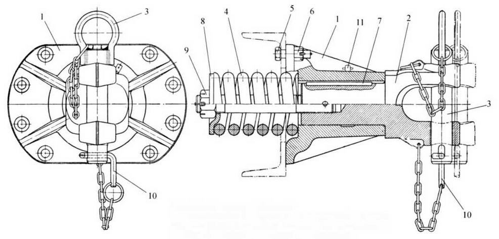 1 — кронштейн; 2 — крюк; 3 — шкворень; 4 — пружина; 5 — болт; 6 — гайка; 7 — шпонка; 8 — упорная шайба; 9 — гайка; 10—чека; 11 — масленка