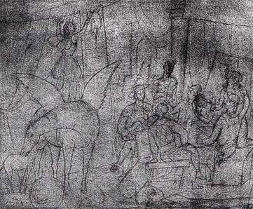 В 1917 году Пикассо создает задник к балету «Парад», в постановке которого примут участие несколько основоположников послевоенной культуры (хореограф Дягилев, поэт Кокто, композитор Сати). Внизу слева расположен эскиз занавеса к балету «Парад» (1917, Париж, Музей Пикассо)