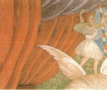 Деталь большого «Занавеса к „Параду“ (1917, Париж, Центр Жоржа Помпиду).Работая над „Парадом“, Пикассо познакомился с русской балериной Ольгой Хохловой, с которой впоследствии написал портрет „Ольга в кресле“ (1917, Париж, Музей Пикассо) (см. след. стр.).