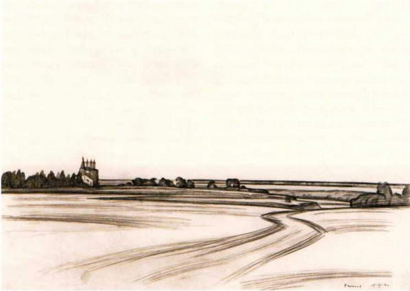 В графических композициях, суммирующих впечатления от глубоко изученной натуры, также прослеживается твердая художественная воля автора к раскрытию идеального смысла натуры. Поэтическое содержание, заключенное в реальных формах жизненного сюжета, он выявляет предельно экономными средствами, точно расставляя акценты на выразительных моментах изображенного реального мира, наделенных высокой зрительной правдой и психологичекой ценностью. Так целая серия превосходных пейзажных зарисовок - Село Дебры (1973), Облако над Окой (1973), Дорога в Красный Яр (1976) - объединена стремлением выразить высокое чувство Родины, вечную красоту русской земли. Компонуя пейзаж, художник заботится, чтобы нужное ему психологическое состояние мотива возникало из верных пропорций и структурно-пространственных отношений, почерпнутых в самой природе. При этом он избегает дробной детализации, не боится пустых мест, заставляя незаполненные участки плоскости активно участвовать в создании образа, служить метафорой земной и небесной тверди. Так, доминирующим элементом в образной структуре рисунка Дорога в Красный Яр является вьющаяся дорога, властно втягивающая взгляд в глубину. В средней части вольного простора виднеется четкий объем деревенской церкви, скрепившей своими островерхими маковками вечный союз земли и неба. Изобразительной основой последнего служит чистая бумага без единого штриха и тонального пятнышка. Значительные отрезки земной поверхности также свободны от касаний карандаша, но при этом наделены пластической выразительностью. Явная условность подобных графических приемов не мешает воображению видеть в созданной с их помощью художественной реальности соответствие настоящей природе.