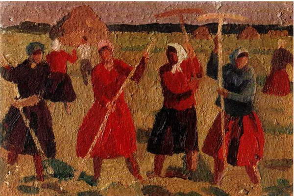 В деревне на первых порах, работая с натуры, Иванов старался не задаваться вопросами «зачем», «для чего» и лишь безотчетно отвечал на творческие импульсы, исходившие из мира наглядных ценностей, прекрасных вещей и явлений. Композиционные замыслы стали появляться как обобщающий вывод из накопившихся жизненных наблюдений. Среди дивной природы рядом с крестьянским домом громче звучал голос живой жизни, острее воспринимался стихийный символизм природных форм, земных ситуаций и окружающих предметов. С глаз словно спала пелена, затемнявшая высшую суть бытия, доступную уже даже не столько глазу, сколько интуитивному прозрению, эмоциональной догадке, интеллектуальному знанию. Ему открывается глубинное, идеальное значение факта существующего в бесконечном пространстве и времени, связанного с процессом всемирного развития человечества, конечной правдой его интересов и чаяний. Восприятие мира с широкой позиции формирует в нем новое отношение к форме и методу композиционного построения, помогает найти подлинное разрешение художественным проблемам, поставленным окружающей сложной действительностью. Органичный для него метод художественной организации жизненного материала, группировки фигур опосредует идеал живой человеческой общности, гармонического единства естественной и рукотворной реальности. «Жизнь вообще, - по словам художника, - а на селе тем более без чувства общности, коллектива, артельности, немыслима. Отсутствие этого чувства - губительный признак»[