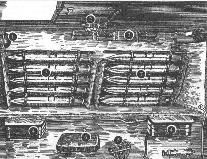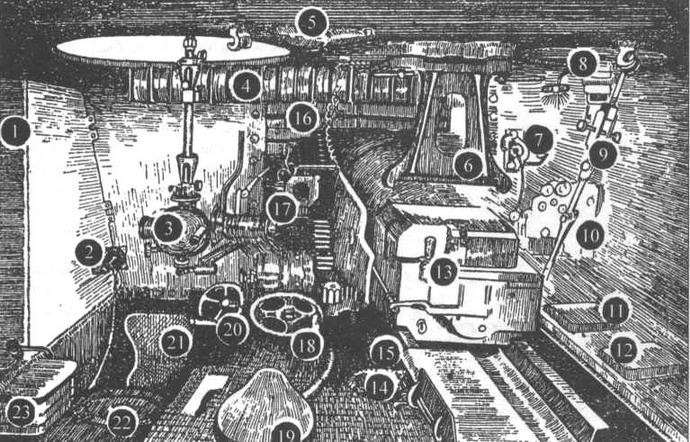 1 — гудок наружного вызова; 2 — плафон; 3 — панорама Гэрца; 4 — обогреватель (керогаз); 5 — люк для загрузки артвыстрелов; 6 — сиденье заряжающего; 7 — снаряды