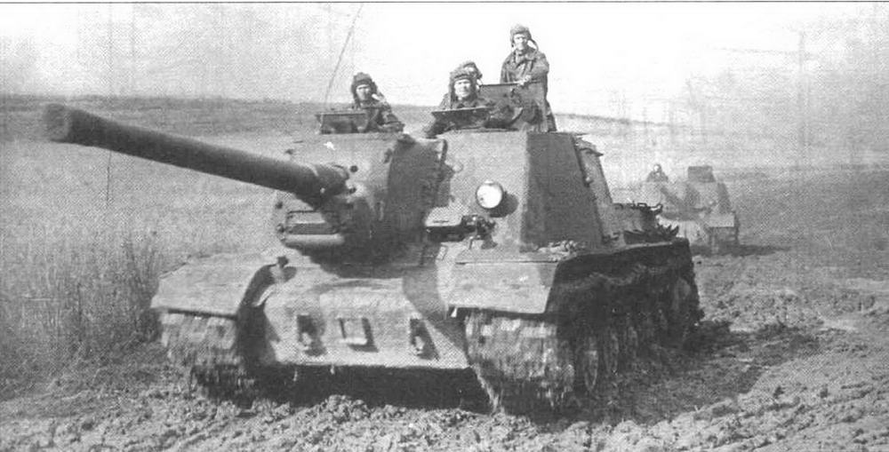 Батарея ИСУ-122 на марше. 1-й Украинский фронт, 1945 год