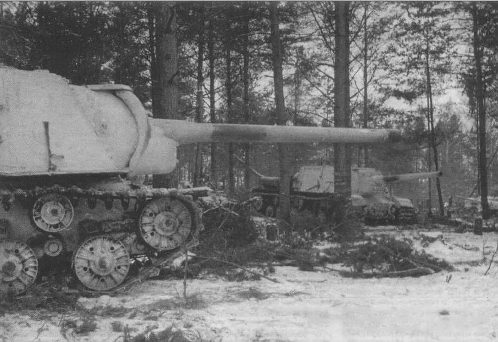 Выкрашенные в маскировочный белый цвет ИСУ-122 занимают огневую позицию на опушке леса. 2-й Прибалтийский фронт, 1945 год