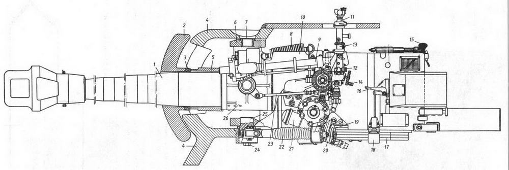 1 — ствол; 2 — подвижная бронировка; 3 — резиновый буфер; 4 — неподвижная бронировка; 5 — муфта; 6 — рама; 7 — верхняя вертикальная цапфа: 8 — уравновешивающий механизм; 9 — телескопический шарнирный прицел; 10 — тормоз отката; 11 — панорама; 12 — боковой уровень прицела; 13 — удлинитель прицела; 14 — рукоятка маховика панорамного прицела; 15 — ручка рукоятки затвора; 16 — спусковой механизм; 17 — уравновешивающий груз ограждения; 18 — реле электроспуска; 19 — маховик поворотного механизма; 20 — маховик подъемного механизма; 21 — подъемный механизм; 22 — поворотный механизм; 23 — привод панорамного прицела; 24 — регулирующая гайка; 25 — вертикальная нижняя цапфа; 26 — люлька