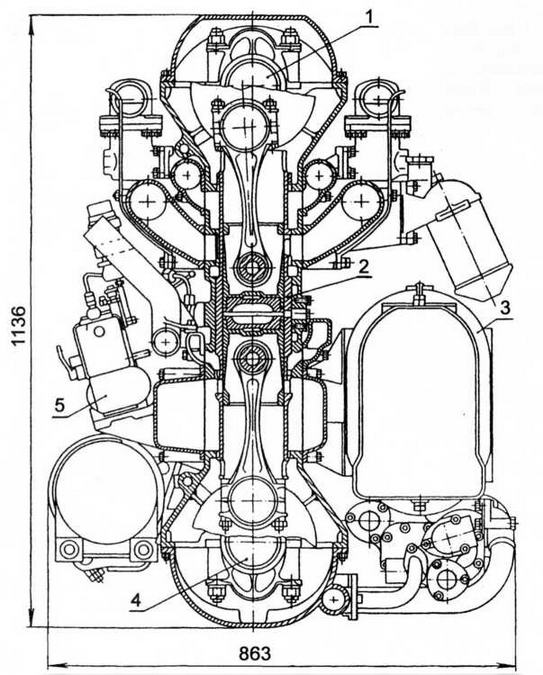 1 — верхний коленчатый вал; 2 — гильза цилиндра; 3 — компрессор; 4 — нижний коленчатый вал; 5 — топливный насос высокого давления