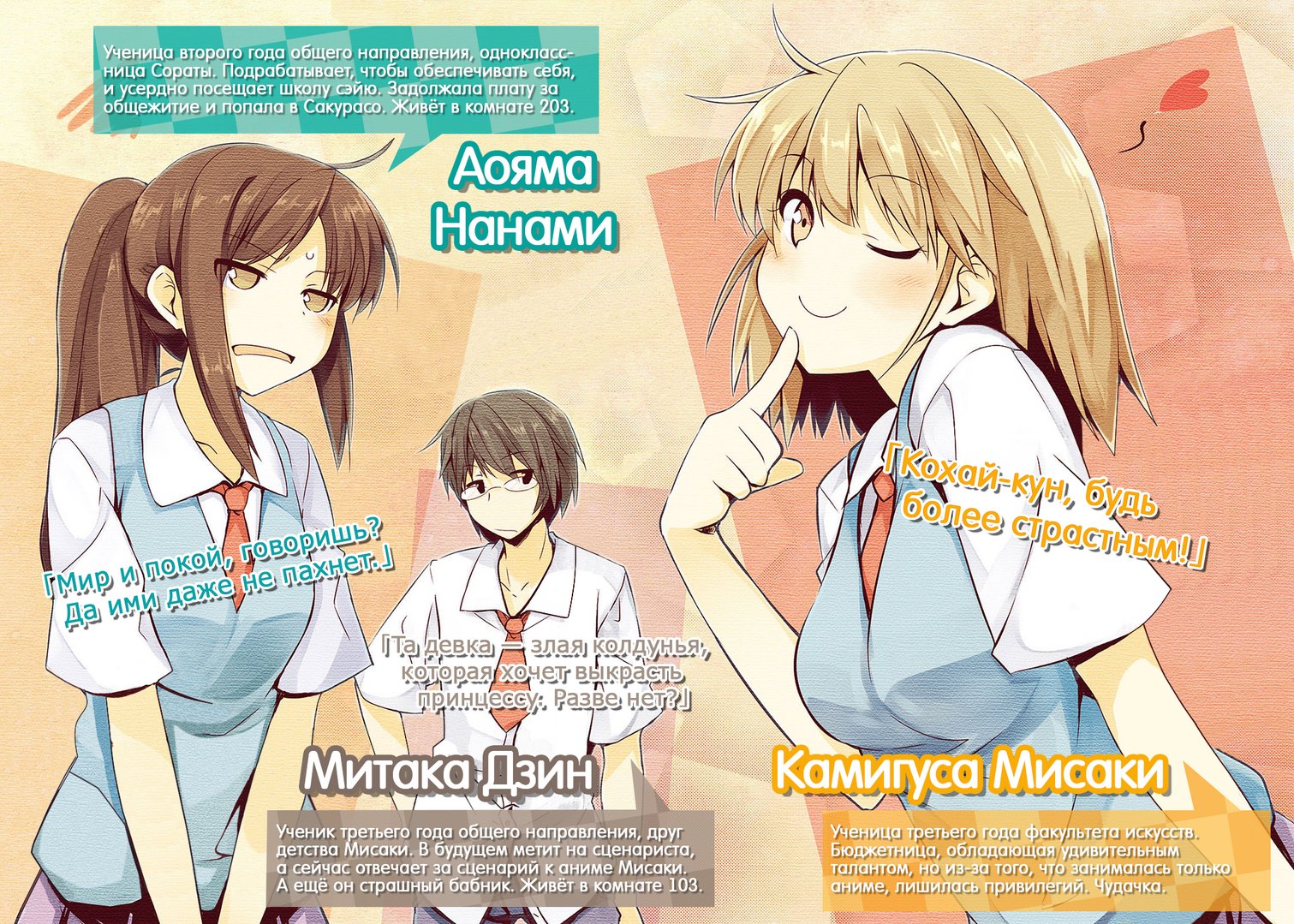 — Совсем не понимаю чувства людей...Шёл первый день сентября. Проснувшийся в кои-то веки самостоятельно, а не из-за кошек, Канда Сората рассеянно глядел в потолок и бурчал себе под нос.Комната 101 в Сакурасо. Интересно, сколько раз он встречал тут утро? Прошло уже больше года, как он жил в притоне проблемных учеников. Тело и душа настолько привыкли к новому жилищу, что Сората чувствовал себя как дома и без проблем вставал рано утром. Но сегодня всё было немного по-другому. Хотя парень не мог даже приоткрыть сонные глаза, в голове царила удивительная свежесть, а в теле поселилось необъяснимое напряжение. — Вообще не понимаю...Если бы вместо этого у него сильно сдавило в груди или его скрутила невыносимая боль, было бы даже лучше.— Ну ладно!Чтобы сменить пластинку у себя в мозгах, Сората приподнялся и скрестил ноги на кровати.Кошки на душе у парня скреблись по вполне понятной причине. Ему не давали покоя результаты недавнего прослушивания.Сората хотел забыться в шумной компании жителей Сакурасо, глядя на фейерверки, но даже целой ночи не хватило, чтобы всё забыть.Он хотел перекрыть неприятные воспоминания приятными. А что делать дальше — толком не знал, и это сильно мучило его.Но он понимал, что бесконечные размышления ничем не помогут...— Вот блин. Сегодня начинаются уроки... Сколько там времени?Сдерживая зевок, парень глянул на часы около подушки.Стрелка показывала полпятого.— Так ещё ночь.Сората потёр сонные глаза. Хотелось завалиться обратно, но тревожные мысли всё равно не позволили бы ему погрузиться в мир сновидений.— Эх... — вздохнул Сората и сделал глубокий вдох. И тут же ощутил непривычный аромат. Не то чтобы незнакомый, но и не совсем уж обыденный. — Это же...Вроде пахло краской, которую используют для рисования. С чего бы в его комнате стоял такой запах?Парень озадаченно осмотрел тускло освещённую комнату и приметил нечто странное на стене. Хотя ещё вчера там были монотонные, безвкусные обои, в одном месте их полностью изрисовали.Наибольшее внимание привлёк рисунок гигантского робота-кота, стоящего на задних лапах. Вокруг здоровяка вилась куча других гигантских монстрокотов, которые, видимо, с ним боролись. Стиль и цветовая палитра создавали сказочную атмосферу, помимо которой в рисунке чувствовалась интересная сюжетная составляющая. Неужто фан-арт по новому аниме?— Что это тут?Хотел бы Сората, чтобы это оказался сон. Но парень прекрасно знал, что здесь, в Сакурасо, живёт пришелец, привыкший устраивать подобные розыгрыши. Если выбирать между сном и реальностью, то придётся признать реальность более правдоподобным вариантом.Пока Сората ломал голову, как избавиться от граффити, дверь, которую оставили приоткрытой для семи подобранных кошек, с силой распахнули с другой стороны.— Утречка, Кохай-кун!В комнату нагрянула инопланетянка из комнаты 201 — Камигуса Мисаки, как всегда в приподнятом настроении. И на лице у неё красовалась лучезарная улыбка без малейшего раскаяния за содеянное. Девушка будто уже собралась в школу — надела форму и --">