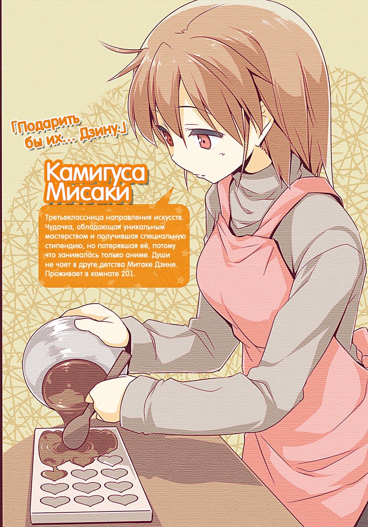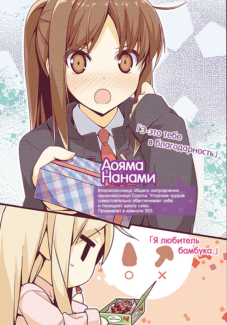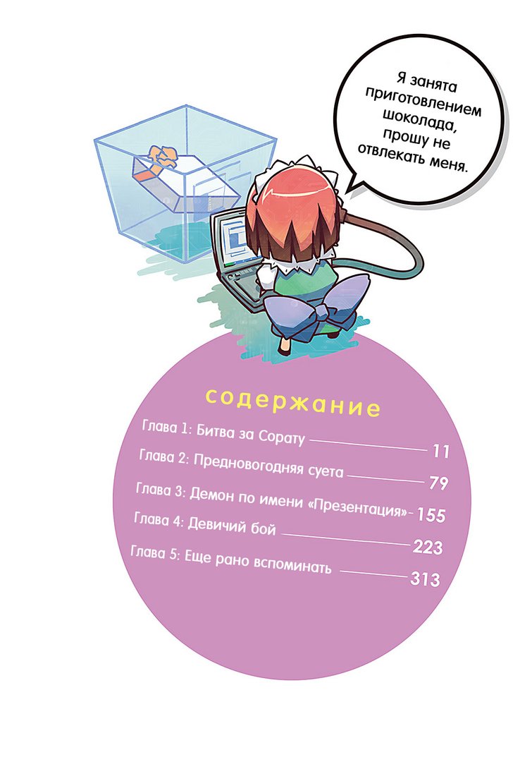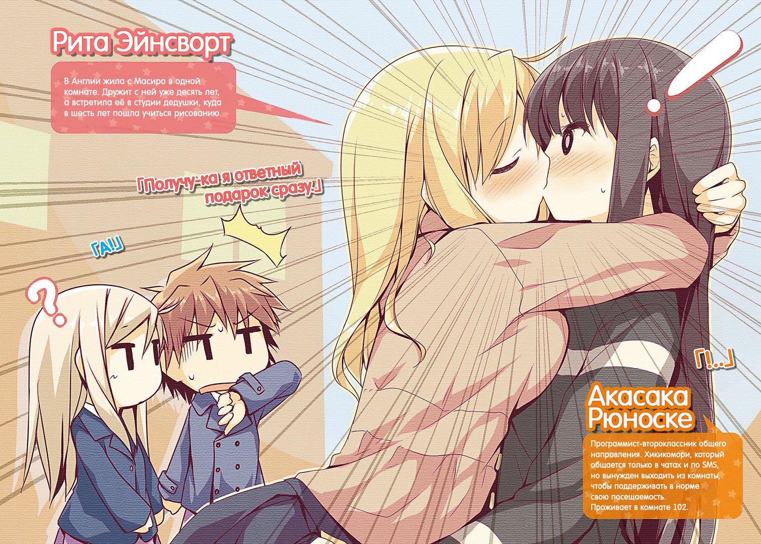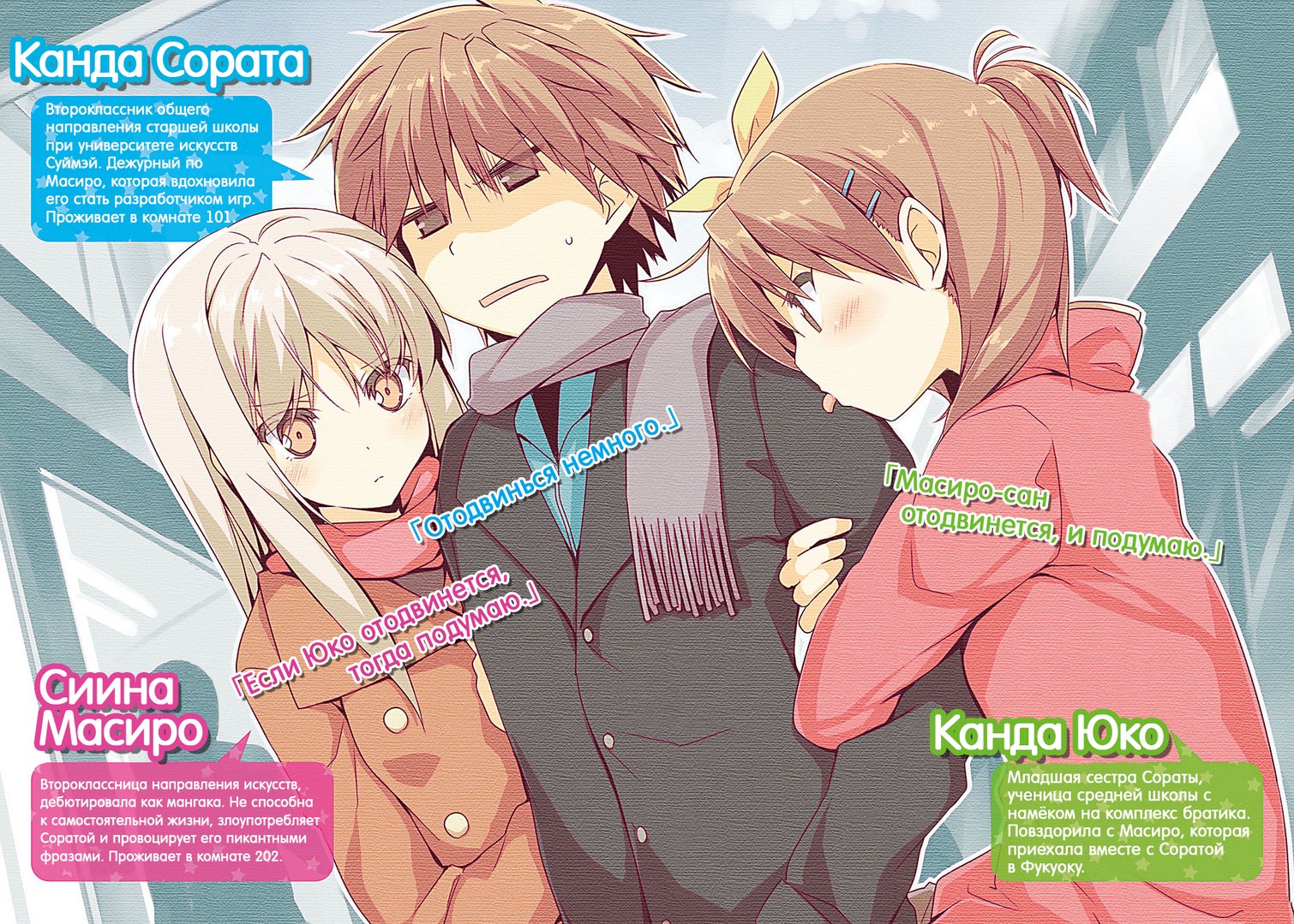 «Отправляемся от Кокуры, следующая остановка Хаката — конечная».Пока в вагоне проговаривалось объявление, поезд выехал через тоннель Синкаммон и прибыл на Кюсю. Время немного перевалило за полшестого вечера. Хотя из Сакурасо отправились сразу после полудня, за окном уже стемнело.До конца долгого путешествия оставалось недолго. В теле накопилась усталость, и скорое прибытие по-настоящему радовало. Должно было радовать, но лицо Канды Сораты выглядело мрачным.«И как я дома всё объясню?»Парень покосился на соседнее сиденье. Причина упадка его настроения заключалась в… нет, она сидела прямо там.— Что?Заметив взгляд Сораты, соседка посмотрела на него. Её звали Сиина Масиро. С прозрачными глазами, хрупкая и хилая на вид, она очаровывала с первого взгляда, не давая себя забыть уже никогда. Однако её внешняя хрупкость обманывала.Она с самого детства посвятила себя одному только рисованию, и общих представлений о жизни в итоге ей ой как не хватало. Если за ней никто не будет присматривать, она не сможет даже выйти в люди, не говоря уже о бытовых делах.Потому Сората, будучи «дежурным по Масиро», стирал её одежду, выбирал ей трусы, готовил бэнто, ел то, что ей не нравилось, и даже убирался в её комнате. Уже девять месяцев он так жил и к нынешнему времени успел привыкнуть.Но под конец года Сорате бросили новый вызов.Последней остановкой поезда Нодзоми была Хакута — префектура Фукуока. И там жила семья Сораты. Да, сейчас он держал путь именно домой.«Ну и что мне теперь делать…»Совершенно не ведая о мыслях Сораты, Масиро на своей волне совала в рот сладости в форме ростков бамбука.«Что бы я ни придумал, всё бесполезно».Отчаяние и смирение шли нога в ногу, и парень удручённо свесил голову.Тут Масиро поднесла к его лицу белоснежную, красивую руку.— Вот, держи.В ней оказалась конфета в форме гриба.— Я вообще любитель бамбуковых ростков.Едва Сората сказал, как Масиро кинула себе в рот последний росток бамбука. А потом прожевала его, как маленький зверёк, и звучно проглотила.— Грибы тоже вкусные.— Тогда почему у тебя остались одни грибы?!— Потому что Сората не ест.— Может, потому, что ты ешь бамбук, бамбук, бамбук, бамбук, бамбук, бамбук, гриб, бамбук, бамбук, бамбук, бамбук!— Сората только на меня и смотрит.От встречной смертельной, хладнокровной атаки Сората невольно поперхнулся. Сделал глоток чая и привёл себя в порядок.— По-потому что, когда я не смотрю на тебя, не знаю, что ты можешь учудить!— Я любитель бамбука.Его оправдание пропустили мимо ушей.— Если вдруг окажется, что ты любишь грибы, я точно взорвусь!Больше Сорату подобное не удивляло. После девяти-то месяцев. Да и если брать конкретно нынешний случай, ему нравилось вспоминать былое, глядя на тупорылую Масиро. До вчерашнего дня… до сочельника, когда они помирились, они --">