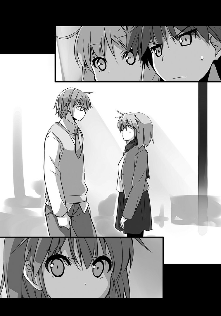 — Тогда давай заново?— ...— Мы ведь немного повзрослели?— ...— Думаю, теперь всё у нас получится.— Плохие у тебя шутки, Фуука.— Жаль. Ты всегда напряжён, Дзин, а я просто хотела, чтобы ты расслабился.— Куда мне до тебя, Фуука… Напряжён так напряжён.— Не делай лицо, как у брошенного щенка. А то я как будто дразню тебя.— Ты почти попала в точку.— Ну и ладно. Посмотрю я на тебя — и немного веселее становится.— Как жестоко. Ну, и что сегодня удумала?— Ты намылился в осакский универ? Я слышала от твоей матери.От этих слов Сората напрягся всем телом. И теперь не мог посмотреть Мисаки в лицо. Нервы натянулись как струны. Хоть он и собирался рассказать ей о том, что Дзин задумался о переводе, при виде нынешней картины сердце Сораты охватил страх.Он робко посмотрел вбок и проверил Мисаки. Но на её лице отобразились вовсе не те эмоции, которые Сората ожидал. Мисаки моргала, не переставая, и пристально наблюдала за Дзином и Фуукой, и по её глазам было совершенно невозможно определить, о чём она думает.Сората боялся, что Мисаки выскочит и начнёт засыпать Дзина вопросами, но ничего такого не произошло. Наоборот, она сохраняла невиданное спокойствие, что ещё больше напугало Сорату.— Когда что-то говорим родителям, прощайте, наши секреты.— Почему Осака?— Факультет литературы там лучше, чем в Университете Искусств Суймей. Вот почему.Возможно, Дзин и не врал. Но Сората знал, что прежде всего он преследовал цель уехать подальше от Мисаки. И Фуука тоже должна была его раскусить.— Ты научился лучше оправдываться.— Бьёшь не в бровь, а в глаз, да?Дзин хило засмеялся, дёргая плечами и носом.— Когда ты встречался со мной, всегда быстро замолкал и не умел врать.— Полагаю, это ты меня закалила.— Не очень-то приятно слышать.— Это правда, что для роста мужчине нужна очаровательная женщина.— Если продолжишь трепаться, я тебя ударю.Дзин поднял руки, сдаваясь.— Мерзкий у тебя характер. Ну и? Почему не сказать Мисаки?— Когда настанет время, я скажу.— И когда же оно настанет!— Ты пришла ради этого?..Всего на миг Фуука потеряла дар речи, что подтвердило догадку Дзина. Но секундой позже она вернула прежнюю прыть.— Из-за кого, по-твоему, я порвала с тобой?Мисаки рядом с Соратой принялась сопеть. Она сжала оба кулака, словно пытаясь что-то пересилить. Впервые увидев такую Мисаки, Сората не на шутку перепугался.— Наверное... всё из-за нас двоих.— И правда, теперь ты не церемонишься.— Я ведь в следующем году тоже буду студентом. Если только поступлю… Уже не к лицу вести себя по-детски.— Если завалишь, ничего страшного.— Я думал, тут положено желать удачи.— Ничего страшного, если завалишь.— Кстати, мне это в тебе и нравилось.— И уходить от темы ты хорошо научился.— ...— Дзин.Фуука, посерьёзнев, назвала его по имени.— М?— ...Она открыла рот, намереваясь что-то сказать, но в итоге промолчала.А потом:— Поеду назад, проводи меня до станции, — сказала она и, не став ждать ответа, зашагала одна.— Как пожелаешь, — наигранно повёл себя Дзин и последовал следом.Парочка прошла прямо перед кустами, где спрятался Сората, и ушла тем же путём, каким изначально пришла. Тем временем Мисаки крепко держала Сорату за руку. Даже красные следы на коже проступили...Хотя фигуры Дзина и Фууки скрылись из виду, она ещё не отпустила Сорату.— Мисаки-сэмпай?— ...— Сэмпай?Постепенно силы покинули её руки, и Мисаки неспешн