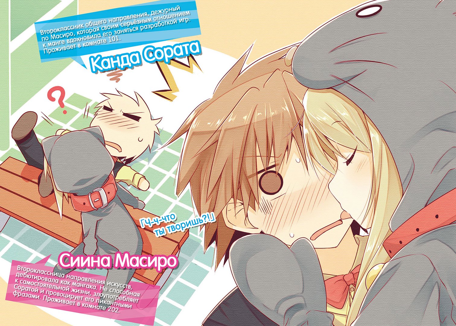 Оторопев от чрезмерной пылкости Мисаки и проорав «ты чего», Сората перепугался и пришёл в чувство. Он должен был стоять на обзорной площадке в аэропорту, но теперь перед глазами предстала привычная комната на шесть татами.Сакурасо — общежитие школы Суймэй при одноимённом университете искусств. Комната 101. На стене красовалось эпичное граффити Галактического кота Няборона, а на кровати нежилась семёрка подобранных кошек.Определённо, комнату Сораты ни с чем не спутать.— Неужели… мне снился сон, а это — реальность?Парень с трудом понимал, хорошо это или плохо.— Вот те на, умудрился же стоя заснуть...Когда Сората продрал глаза, он понял, что стоит почти в центре комнаты. Ничего удивительного, ведь последнюю неделю он настолько погрузился в подготовку программы «Галактического кота Няборона», надеясь успеть к сроку, что не успевал спать.Парень хорошенько зевнул, и на глазах проступили слёзы, от которых защипало.Более-менее он вернулся из мира снов, но теперь будто снова заснул.— И что за сон вообще такой...Последнее время Сората только о работе и думал, но чтобы Няборон вторгся в мир его снов… И то же касалось Масиро. Заставил её во сне говорить не пойми что. А ведь после тёрок с Ритой, которая пыталась вернуть Масиро в Англию, он стал чувствовать себя немного неловко… Когда он вспоминал, как без конца орал «Не уезжай», ему хотелось рвать волосы на голове. А после таких снов Сората и вовсе не сможет посмотреть ей в глаза.— Кохай-кун, ты бодрячком?Глаза почти слиплись обратно, и парень их потёр. Его звала Камигуса Мисаки — инопланетянка из комнаты 201. Если подумать, как раз от Мисаки ему во сне досталась беспощадная оплеуха. А если подумать ещё, то даже в реальности левая щека пылала от жара и ныла от боли.— Прошу простить за неуместный вопрос, Мисаки-сэмпай, но каким это образом вы меня пробудили?— Я прибегла к популярному земному обычаю.— Да где ты нашла на Земле обычай будить людей ударом по лицу?!— Не ударом! А тренировкой автографа!В очередной раз Мисаки несла несусветную чушь.— Автограф?— Да, вот зеркало.Сората с неохотой изучил своё лицо в зеркальце, которое поднесла к нему пылкая Мисаки.— Да~ вот как-то так получилось, что думаешь?С чего это она вела себя, как в салоне красоты, парня сейчас не волновало. Хотя персонального цуккоми очень уж захотелось.На левой щеке липкой красной краской нанесли какие-то закорючки. Разумеется, правая рука Мисаки запачкалась в той же краске.— Какой ещё автограф, ты кто, ёкодзуна?! И не надо расписываться с таким усердием!— Самое главное, что тебе понравилось, Кохай-кун.— Ничего мне не понравилось, я наоборот взбесился от пощёчины!— Сам виноват, Кохай-кун, спал стоя.— Жирафы в саванне тоже спят стоя! Уважай диких животных!— В зоопарке жирафы приседают и наклоняют голову, когда спят!— У них там нет врагов, вот и расслабились! Они там растеряли гордость диких животных!— Я понял, что ты сечёшь в жирафах, успокойся. Я ничего не слышу, — раздался голос человека, который сидел перед телевизором и смотрел на экран, — Митаки Дзина. Приятной наружности парень жил в комнате 103, приходился Мисаки другом детства и учился на третьем году. Он не оторвался от экрана, поскольку занимался отладкой драматической части «Галактического кота Няборона».— И вообще, Мисаки, дуй в школу. Пора бы тебе заняться раскруткой и подгото