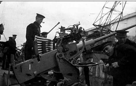Мобилизованные суда получали на вооружение два 76,2- мм или 45-мм орудия и два пулемета «Максим». Катера- тральщики вооружались 7,92-мм пулеметами MG-08 германского производства времен Первой мировой войны. Поэтому усиление зенитного вооружения началось уже зимой 1941/42 года. Особенно быстро этот процесс пошел в 1943 году. На девяти сторожевых кораблях и 12 тральщиках были установлены по 2-3 орудия 20-мм калибра. Пять речных тральщиков Беломорской флотилии получили на вооружение пулеметы ДШК или «Кольт-Браунинг». Продолжалось усиление зенитного вооружения импортными системами и в первой половине 1944 года. Общее число 20- мм орудий МЗА на отдельных кораблях достигало пяти стволов. Аналогичные мероприятия проводились и на других флотах. Например, в 1943 году все корабли ЧФ, переоборудованные из гражданских судов, были дополнительно довооружены импортными 20-мм автоматами и 12,7-мм пулеметами.