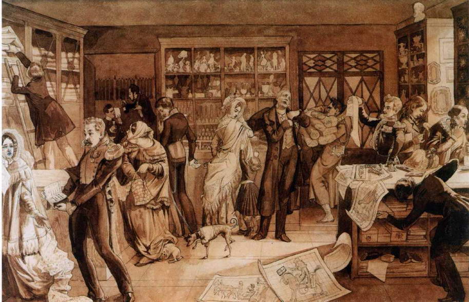 В сепиях присутствует пока еще эстетически не упорядоченная смесь правдоподобия с условностью сценического поведения и пантомимической режиссуры. Федотов вовсе не стремится уверить в том, что это «списано с натуры». Его цель иная: создать образ мира, где распались все связи, где все разорвано и каждая сцена, эпизод, фигура, вещь, по большей части, клоунским фальцетом кричит о том, о чем на высоте трагического пафоса вещал Гамлет, а именно, что «распалась дней связующая нить» и «мир вышел из пазов». Общий план, изобразительная стратегия сепий диктуются вовсе не нравственной озабоченностью и желанием открыть людям глаза на пороки городского общежития. Олицетворяющие эти «пороки» ситуации лежат на поверхности, да к тому же слишком расхоже известны, чтобы находить интерес в «открывании глаз» на такого рода элементарные вещи. Федотов создает не сатирические листы, а забавные картинки, удовольствие от которых предполагается в бесконечном нанизывании мелких казусов и деталей: лист из увража с памятником Байрону, который вынимает из папки мальчишка в качестве образца для надгробного монумента почившей Фидельке (Следствие кончины Фиделъки); мальчишка, который забавляется привязыванием бумажного банта к хвосту собачки (Кончина Фидельки); крендельщик приписывает на дверном косяке очередную строку в длинном столбце, документирующем долг клиента {Офицерская передняя) и т. п.