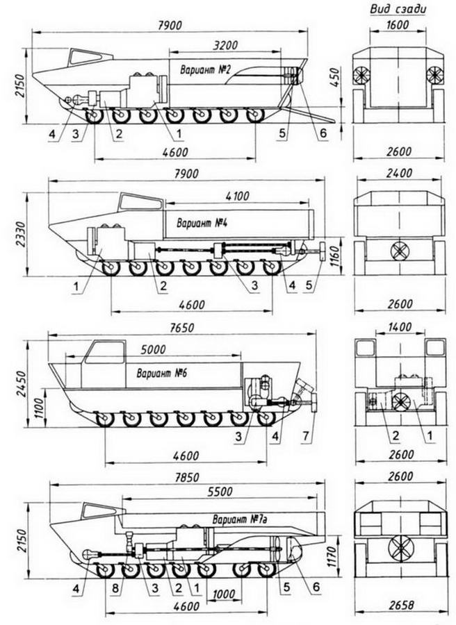 Исходя из этого А. Кравцев предложил второй вариант компоновки. При ширине выбранного трака 300 мм ширина колеи машины получалась 2,3 м, а максимально допустимая длина опорной поверхности — 4,6 м. Особенностью второго варианта стали уменьшение погрузочной высоты транспортера до 450 мм и размещение гребных винтов в тоннелях над гусеницами. При перевозке грузов массой 3 т транспортер имел бы заметный дифферент на корму, что улучшало условия работы гребных винтов. Но при движении порожняком переднее расположение моторно-трансмиссионного отделения (МТО) приводило бы, наоборот, к дифференту на нос и зарыванию машины в воду. Неудовлетворительной получалась эпюра распределения давления ходовой части незагруженного транспортера на грунт, что отрицательно влияло на скорость его движении по суше.