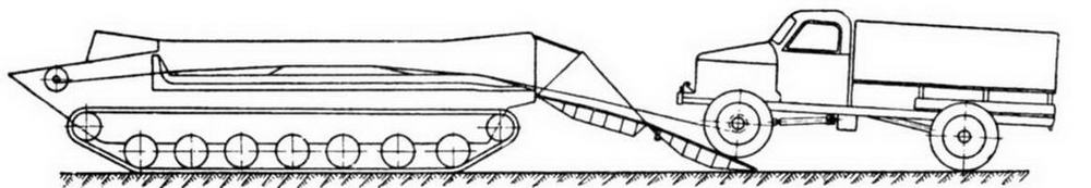 Но это переправочное средство имело и существенные недостатки, связанные с его применением, в частности, сравнительно большое время установки и закрепления лодок АЗ на корпусе танка, на что уходило около 15 — 20 мин, да и на демонтаж требовалось еще 5 — 8 мин. Кроме того, необходим был транспорт для доставки оборудования к месту предстоящей переправы.