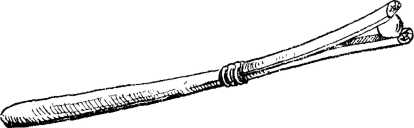 Первоначальный образец пращи представлял расщепленную на конце палку (рис. 3); между этими концами помещали округленный камень — голыш; вследствие значительного размаха палки камень получал большую скорость и летел дальше, чем это можно было сделать рукой без палки.