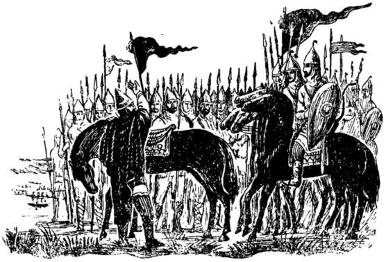Рис. 16. Дружинники князя Игоря Святославовича, вооруженные луками, копьями и мечами.
