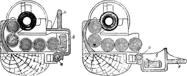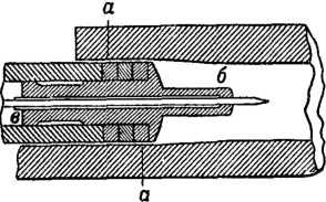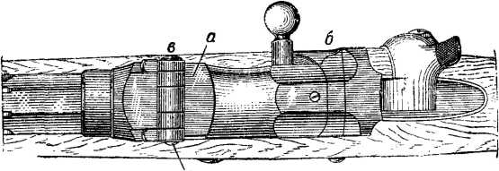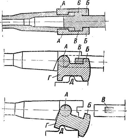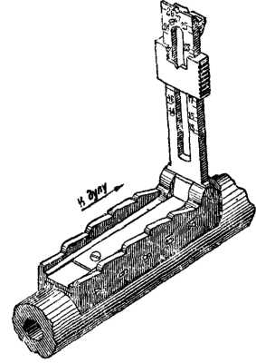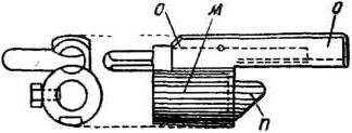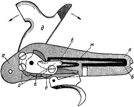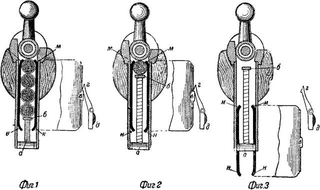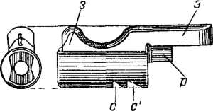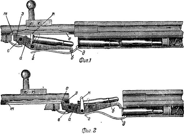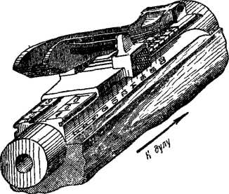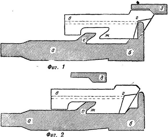 аб (рис. 143, фиг. 1) представляет собой заднюю часть поршня, отбрасываемого при выстреле пороховыми газами, устремляющимися через поперечный канал в стволе. Сцепление затвора