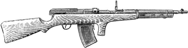 Первым образцом, который решено было принять на вооружение, была винтовка Мондрагона (рис. 144), разработанная для мексиканской армии, обр. 1907 г.; калибр — 7 мм, число патронов в магазине — 10, вес без штыка — 4,12 кг. начальная скорость — 700 м/сек, прицельная дальность — 2 000 м.