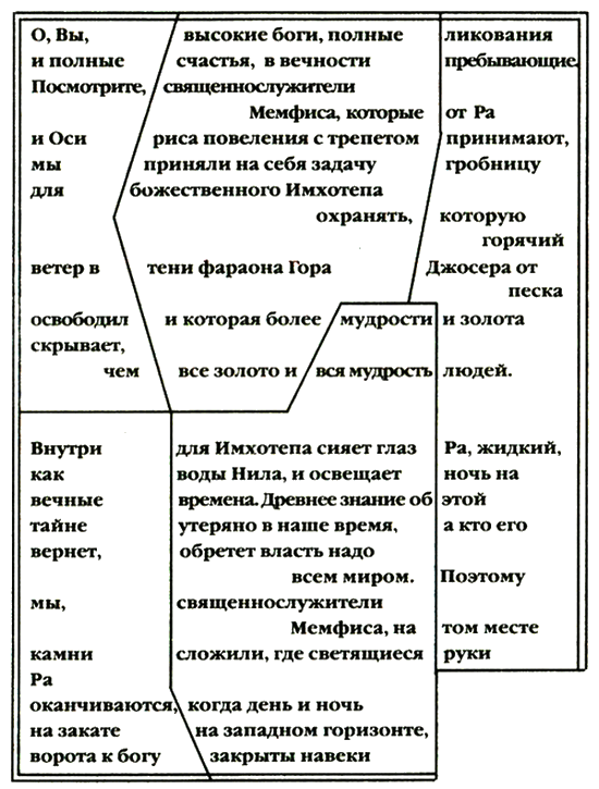 — Последнее предложение текста с плиты из Рашида гласит: «Поэтому мы, священнослужители Мемфиса, на том месте камни сложили, где светящиеся руки Ра оканчиваются, когда день и ночь сравняются на закате на западном горизонте, чтобы ворота к богу закрыты навеки остались».