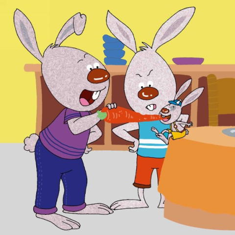 У кожного кролика була своя тарілка: у старшого брата — блакитна, у середульшого — зелена, а помаранчева тарілка належала Джиммі.