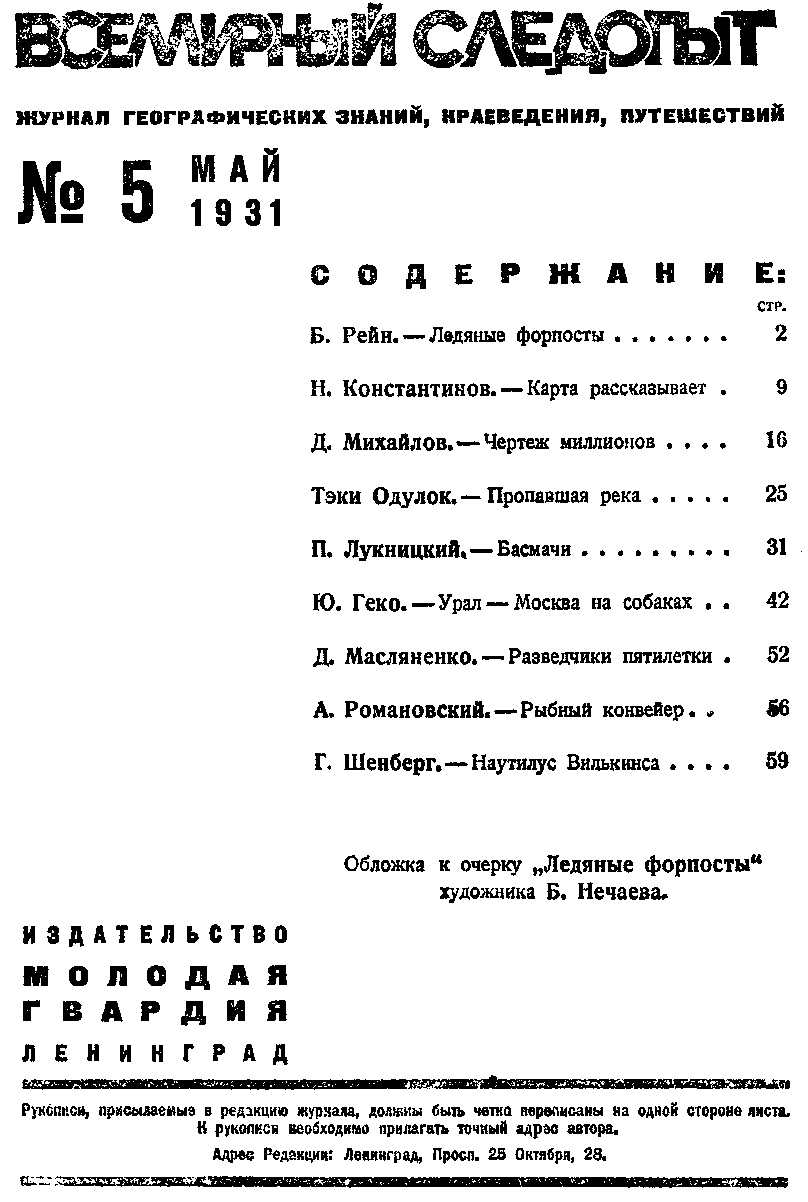 — Не легко в полярных условиях вести научную работу, — вспоминает свою работу полярный геофизик. Он отправился на собаках с самоедом-проводником к Медвежьему заливу на исследование глетчеров. Девять дней был пути. А дорога опасная — прямо по льду Карского моря — по суше дорога малоудобна для собак. Карское море коварно, оно таит тысячи неприятностей. При сорокаградусном морозе шторм ломает вечные льды, гонит их взад и вперед, образуя полыньи.