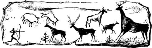 Трудно доступные пещеры служили иногда нашим предкам святилищами, в них совершались различные религиозные обряды. На стенах некоторых пещер до наших дней сохранились рисунки сделанные красной и чёрной краской, изображающие пронзённых дротиками бизонов, мамонтов, оленей (рис. 28), рисунки кистей рук с обрубленными пальцами, а также непонятные для нас колдовские знаки.