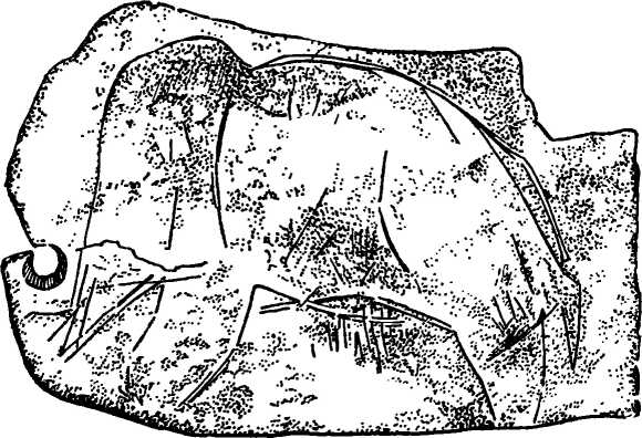 Изображение мамонта, вырезанное на кости верхнепалеолитическим человеком.