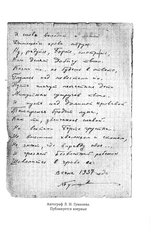 Не исключено, что со временем найдутся еще какие-нибудь литературные произведения Гумилева. В письмах некоторых друзей и знакомых Льва Николаевича упоминаются названия некоторых стихов, которые нам не удалось найти. Так, С.А. Снегов, солагерник Гумилева по Норильсклагу, в одном из своих писем вспоминал его поэму о цинге. А его бежецкий учитель и друг А.М. Переслегин хвалил перевод Гумилева из Данте, который он прочел в журнале, однако нам его найти не удалось. Т.А. Шумовский, арестованный вместе с Гумилевым в 1938 году, сохранил в памяти только одно четверостишие из стихотворения Гумилева о Норильске. (Это стихотворение прочитала Шумовскому женщина-химик, прибывшая по этапу из Норильска в Красноярск, где он тогда отбывал свой срок.)
