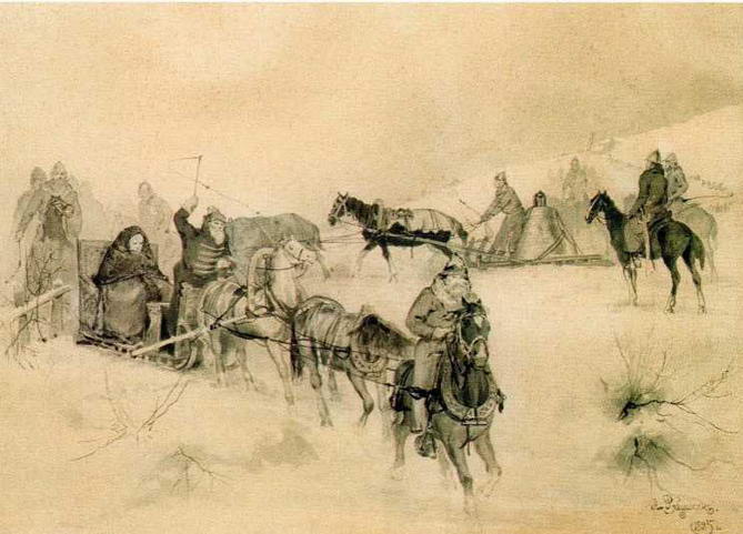 Вернувшись с громадным запасом материала в виде всяких заметок, записок, набросков, чертежей и рисунков, он поселился у И.Ф. Тюменева, арендуя небольшой домик с окном, приспособленным для мастерской, и жил там почти всю зиму 1890-1891 годов. За это время им написана небольшая, но в высшей степени выразительная картина Ожидание новобрачных от венца в Новгородской губернии, которая была принята на Передвижную выставку 1891 года.