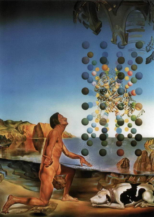 Дали, который всегда так спешил и старался идти в ногу со временем, и тут не отстал и поставил себе новую пластическую задачу - создать живопись, адекватную современной науке со всеми ее чудесами - с новым пониманием структуры материи, с открытием ДНК и с расщеплением атома. Подобно тому, как Н.И. Лобачевский открыл новую, не евклидову геометрию, Дали захотел создать не евклидову живопись, с иным ощущением пространства и времени. И он ее создал. Ведь разве маленькая, обнаженная девочка, легко идущая по воздуху и спокойно, словно тонкую полиэтиленовую пленку поднимающая за кончик море - это не новая реальность, не реальность уже XX века с его резким сдвигом в сторону непривычного и фантастического, о чем прежде писалось только в романах Жюль Верна? Или автопортрет обнаженного Дали, стоящего по пояс в воде, свободно опирающегося на морскую гладь, как на стол, с мирно спящей собакой на морском дне, и созерцающего разлетающийся полет разноцветных молекул ДНК - разве это не ломание всего привычного, тысячелетнего, устоявшегося и не выход в другую реальность, где существуют иные, еще неведомые законы? Или популярнейшая, совсем небольшая работа Дали со странным сюжетом, отраженном в забавном названии: Юная девственница, удовлетворяющая себя рогами собственного целомудрия (1954). Разве даже и эта эротическая картина, купленная журналом Плейбой, не принадлежит к живописи техничного и электронного XX века, в котором все выверено, рассчитано и где торжествуют обтекаемые, гладкие формы?
