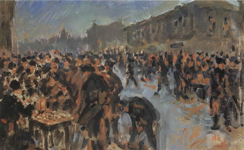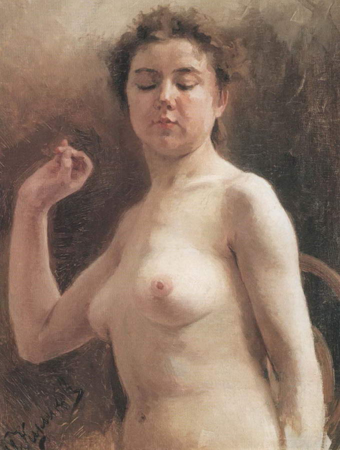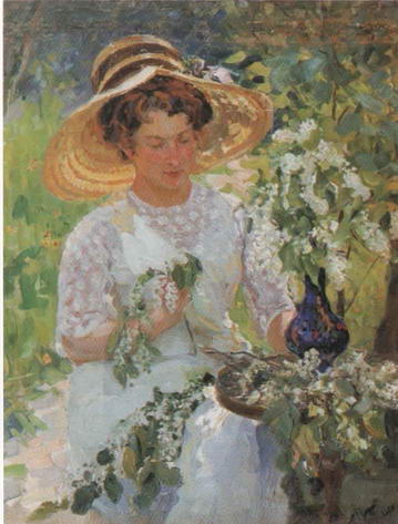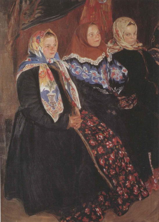 Особенно удались художнику две небольших композиции - этюды Деревенские портные и Нарядилась (1897), в которых художник поборол академическую сдержанность и написал в репинской манере, ставшей характерной для дальнейшего творчества.