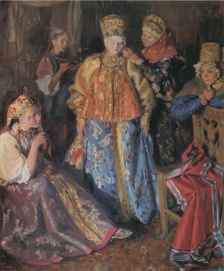 Для многих жанровых композиций Куликову позировали его племянницы, отличавшиеся красотой и статностью. Они были хороши и в роли прях и жниц, умевших управляться с разными работами, и невест, которых бояре прятали в теремах от сглаза.