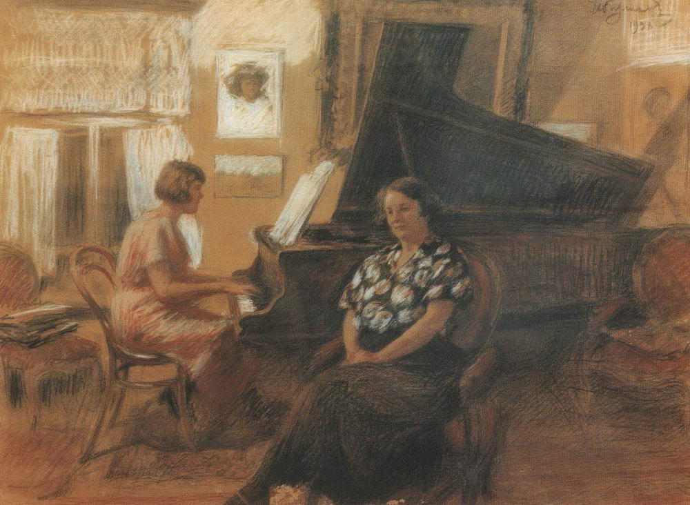 Большое впечатление производит портрет дочери, исполненный маслом в рост на фоне раскрытого рояля (1938).